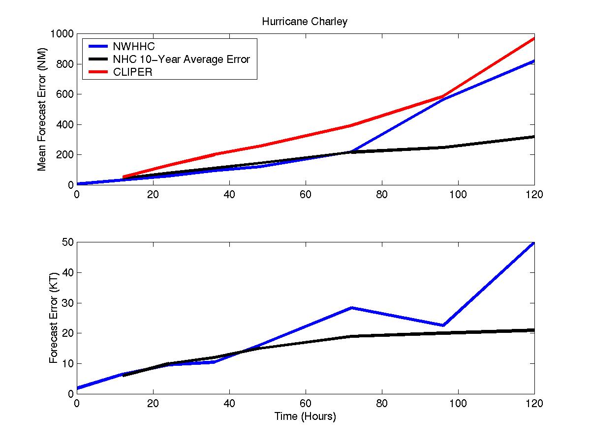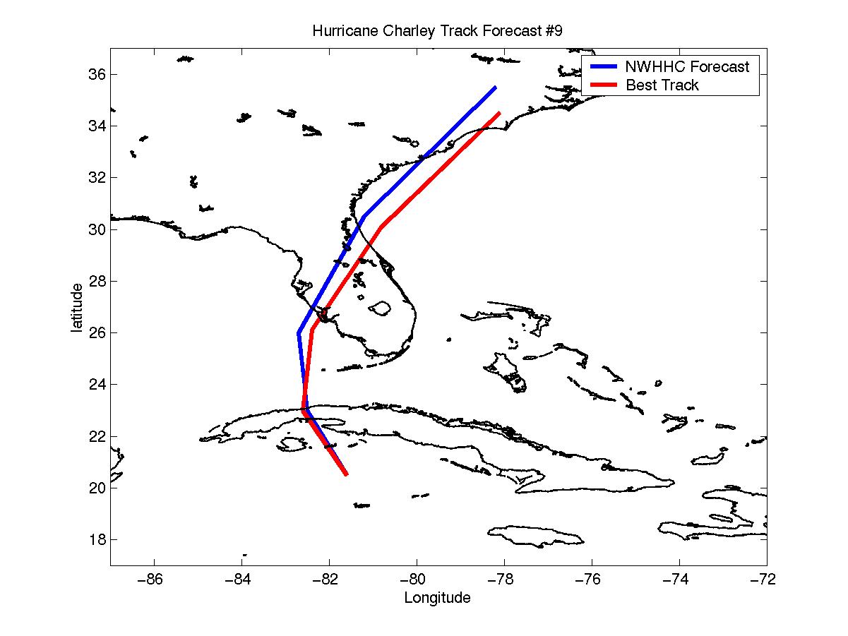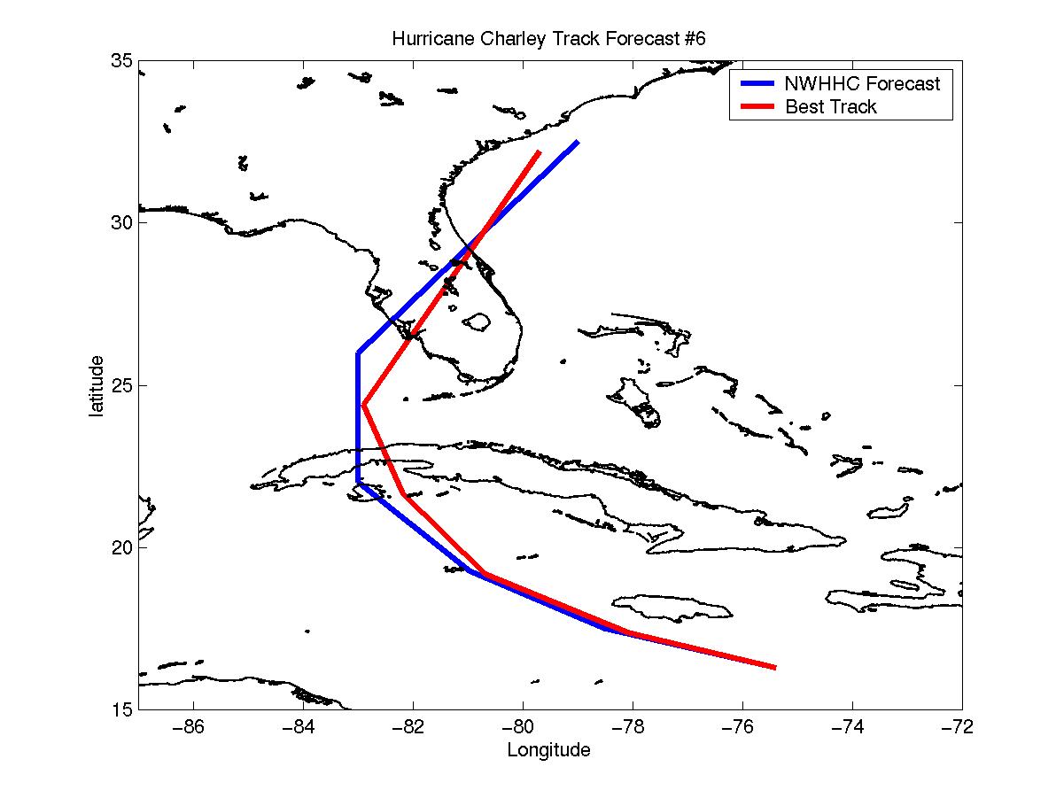 There was a lot of complaints regarding the forecasts for Hurricane Charley by residents in the Florida landfall zone. Very few of these claims were valid. First, the area was under an OFFICIAL HURRICANE WARNING Second, the Official National Hurricane Center Forecasts brought the hurricane very close to Charlotte Harbor. Third, NWHHC forecasts consistently indicated a landfall near the Charlotte Harbor. Therefore, the lack of preparation for conditions through a category 3 hurricane is strictly the fault of the residents of the area. For those who did prepare for a category three hurricane, the lack of preparation for a category four hurricane lies more with the forecaster for not clearly stating the possibility that Charley could become a category four hurricane.